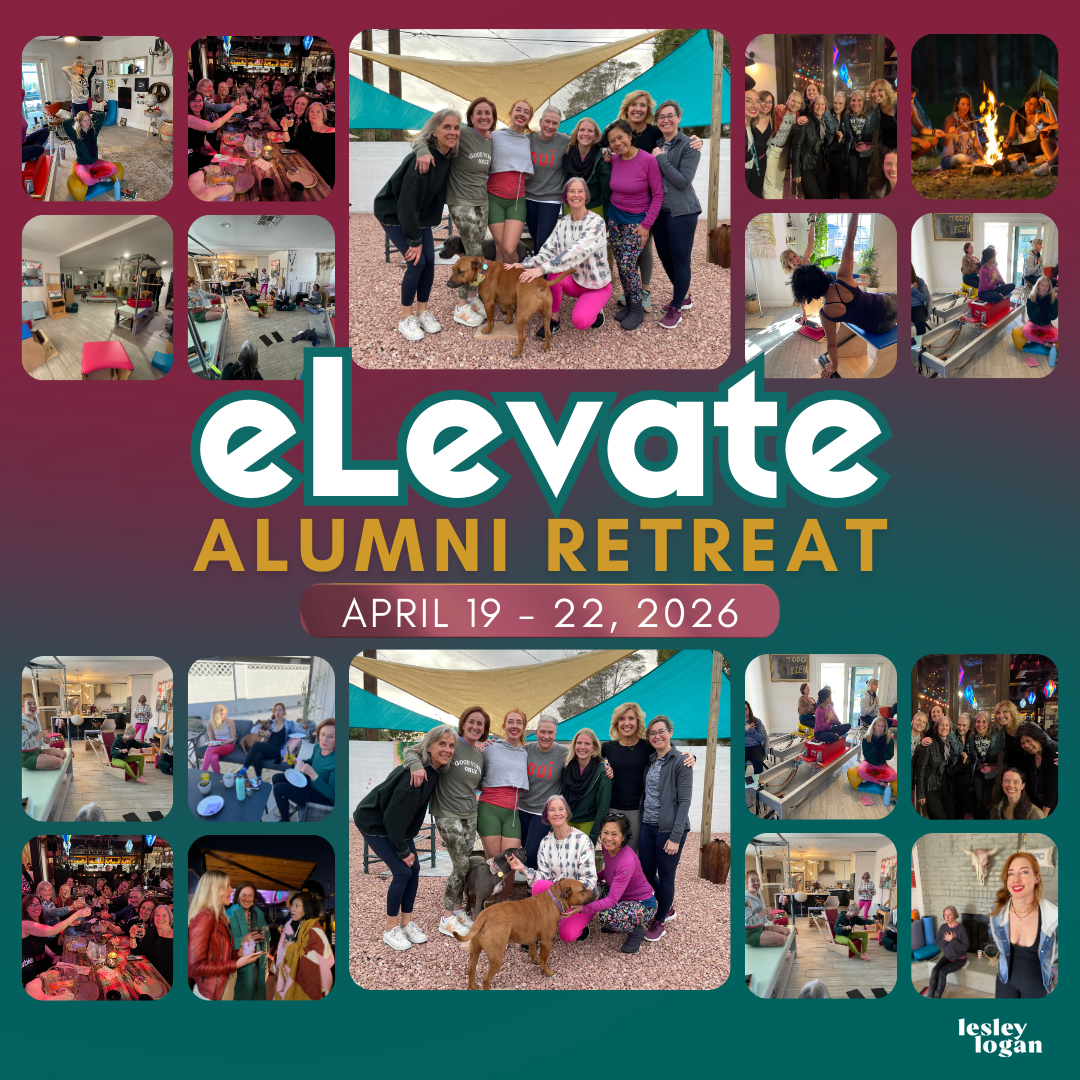 Let’s all eLevate in-person! Meet your fellow alumni, nerd out on Pilates workshops and workouts, and socialize. Book your own accommodations and travel, we’ll cover breakfasts, lunches, and 1 family dinner.